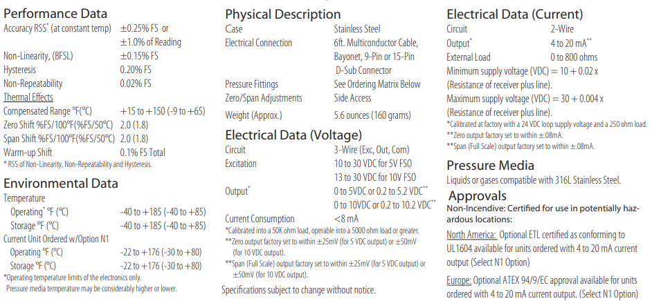 The superior mechanical and thermal stability is achieved through Setra's patented variable capacitance sensor. Its fundamentally simple design features a 316L VIM/VAR stainless steel sensor passivated to 5 Ra (7 Ra. max.) finish, which eliminates surface irregularities and provides the proper surface chemistry for corrosion resistance, and an insulated electrode plate fastened to the center of the sensor diaphragm, forming a variable capacitor. As pressure increase or decreases the capacitance changes. This change in capacitance is detected and converted to a linear analog signal by Setra’s unique electronic circuit. Various tube diameters are available with optional face seal fittings. Sturdy construction allows for trouble-free installation and high tolerance of system torsion and welding effects, providing confident installations.