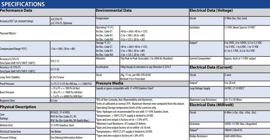 All wetted parts are constructed of corrosion-resistant 17-4 PH stainless steel, which makes this unit ideal for use when corrosive media. The Model 522 offers 0.25% FS accuracy (optional 0.15% FS), compensated temperature range of -5oF to 180oF (-20oC to 80oC), gauge, absolute, and compound pressure ranges from -14>7 psi up to 6000 psi. The Model 522’s modular design is offered in a wide choice of milllivolt, voltage or current outputs over almost any pressure range, and a variety of pressure and electrical connections, enabling this unit to be custom configured for your OEM application.