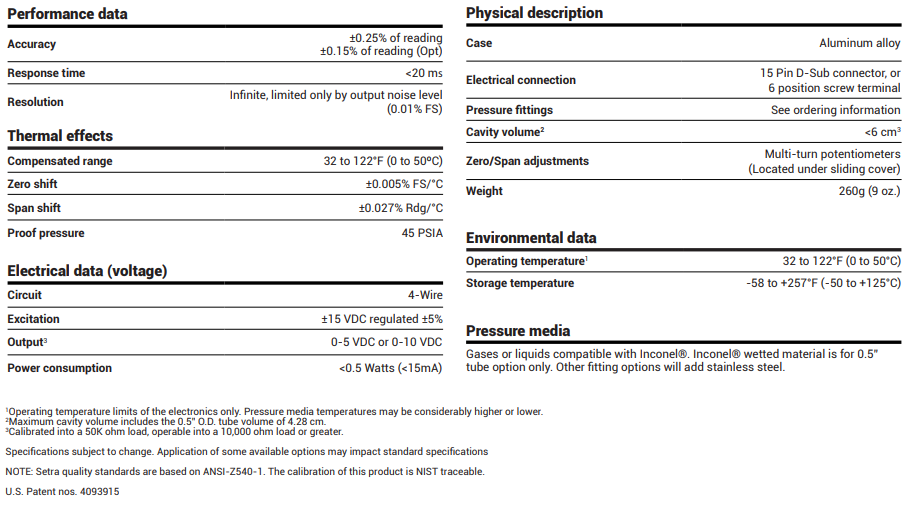 Setra's Model 760 capacitance manometer is an absolute pressure transducer designed for accurate and repeatable vacuum measurements.  Various full scale ranges are available from 10 Torr up to 1000 Torr. The units of measurement may be specified in Torr, mBar/hPa, kPa or PSIA.  The Model 760 operates from a ±15 VDC power supply and provides a 0-10 VDC or 0-5 VDC signal output that is linear with pressure and independent of gas composition. The electrical connection can be either the industry standard 15 pin D-sub or 6 position terminal strip connector.