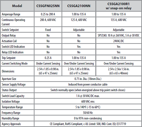 The CSS models are ideal for new installations and provide the greatest savings opportunity. Ideal for direct drive units, small exhaust fans, and other fixed loads, these solid state switches have accurate, very low fixed or user adjustable setpoints, which are activated when the desired amperage is reached. The adjustable CSSGA2100NN and CSSGA2100R1 units have LED’s, which indicate switch status. (User can also adjust the setpoint for over or under loads.) Excitation is magnetically induced from current carrying conductor (wire or cable), making these units completely self-powered.
