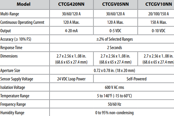 Each unit has a three position slide switch to select the most suit- able range for the application. The 0 to 5V and 4 to 20 mA output units have 30/60/120 Amp sensing ranges. The 0 to 10 V output units have a 20/100/150 Amp sensing range.