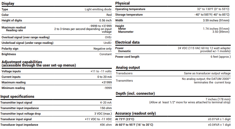 The DATUM 2000™ is a self-contained dual channel system for accurately displaying an output from one or two transducers (or transmitters) located at a remote location. It features an analog to digital converter with an LED display. Programmed with a selectable menu, the DATUM 2000™ can be calibrated by the user to the pressure ranges of the various Setra pressure transducers and transmitters or other analog instruments. Two buttons conveniently located on the front panel allow the user to access the menu. The menu includes: selecting a channel, adjusting or calibrating the output of the meter, setting the decimal point, zero adjustment and Hi/Lo Alarms.