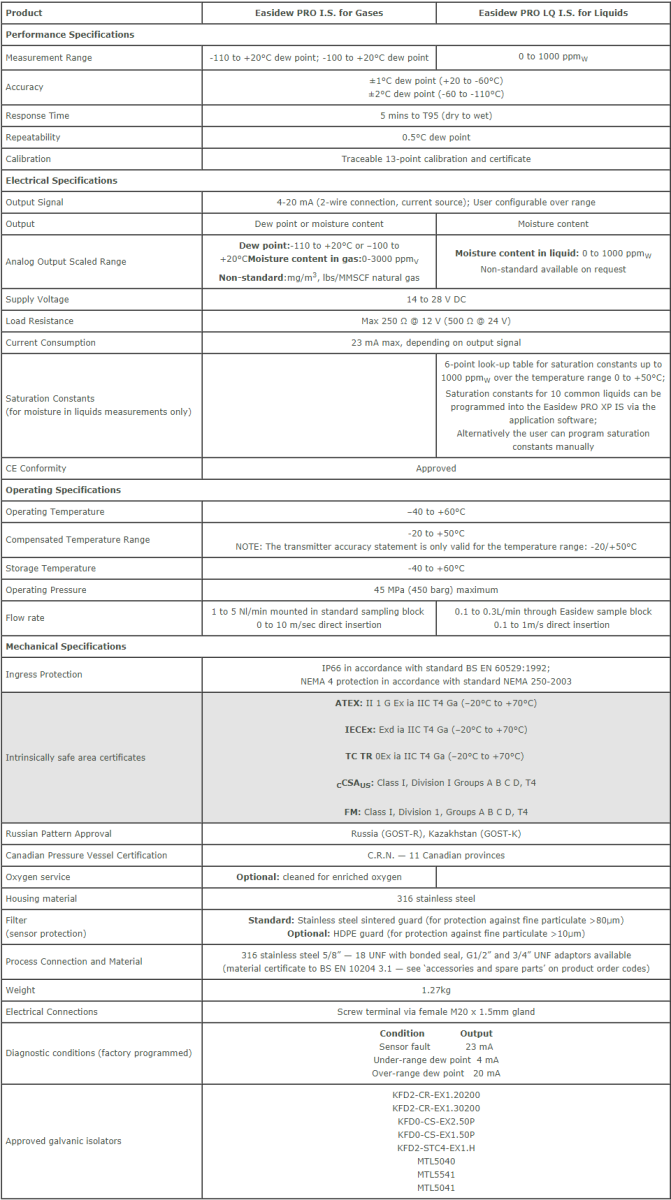 The Easidew PRO I.S. dew-point sensor is designed to reliably and accurately measure dew point or moisture content in a wide variety of gas or liquid analyzer applications. The compact mechanical design minimises installation time and provides a robust and reliable transmitter for all global intrinsically safe hygrometer applications. The Easidew sensor can be used in combination with several of Michell’s moisture meters or moisture analyzers.