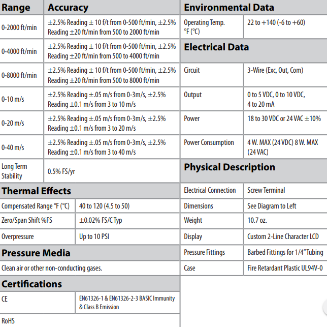 Monitors velocity while giving user the option to measure & display flow, differential pressure, temp & humidity